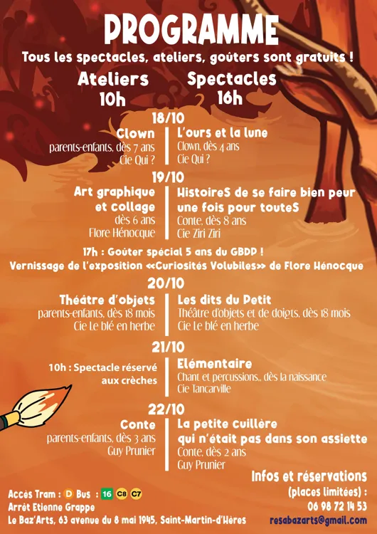 La semaine prochaine (du 18 au 22 Octobre) , notre quartier s’anime avec un festival plein de surprises pour les enfants : ateliers créatifs, spectacles, goûter et plein d’autres activités — le tout gratuit ! 👧🧒